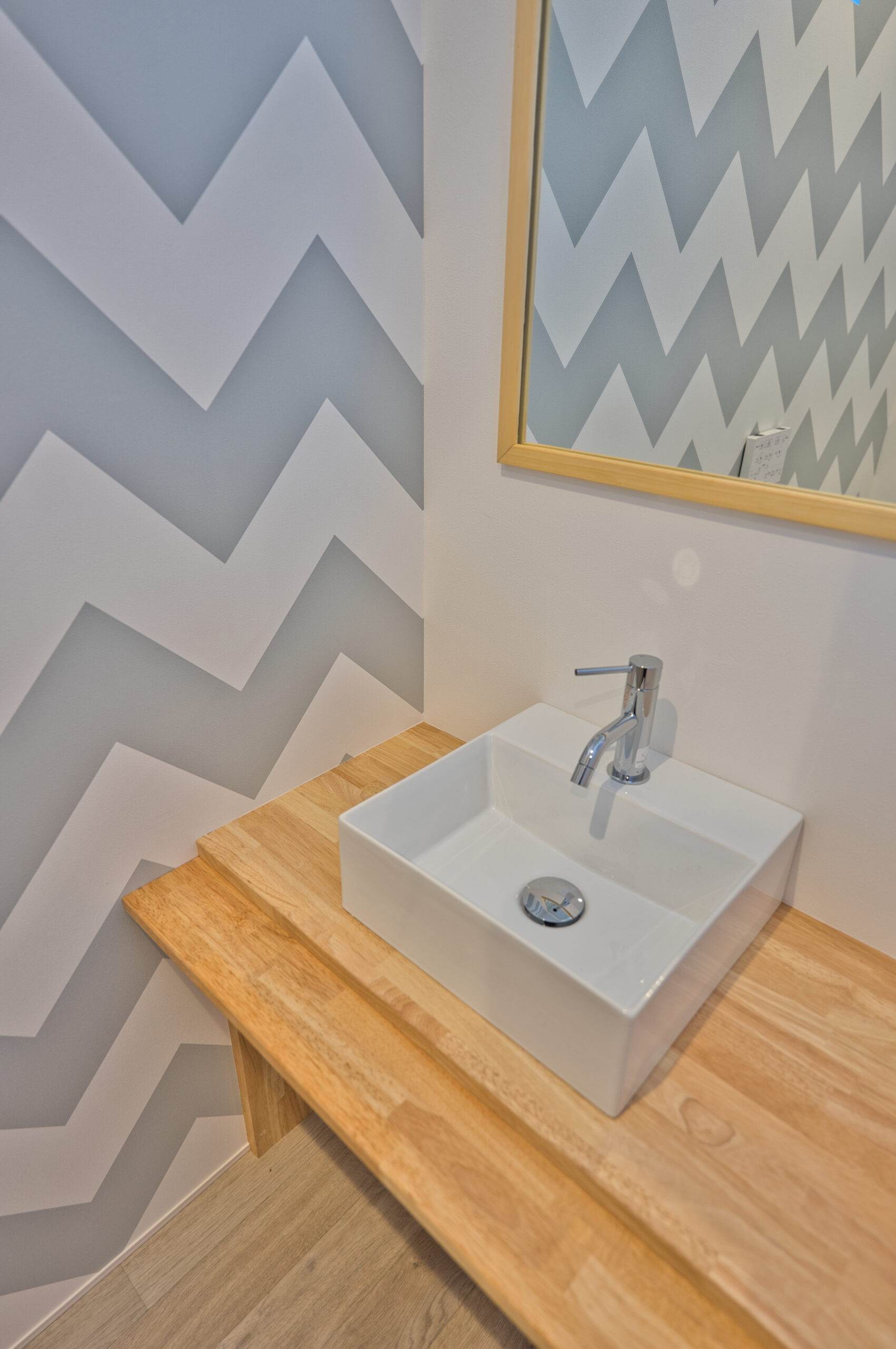 どちらも壁のクロスで遊びを出し、手洗いボウルはシンプルに!