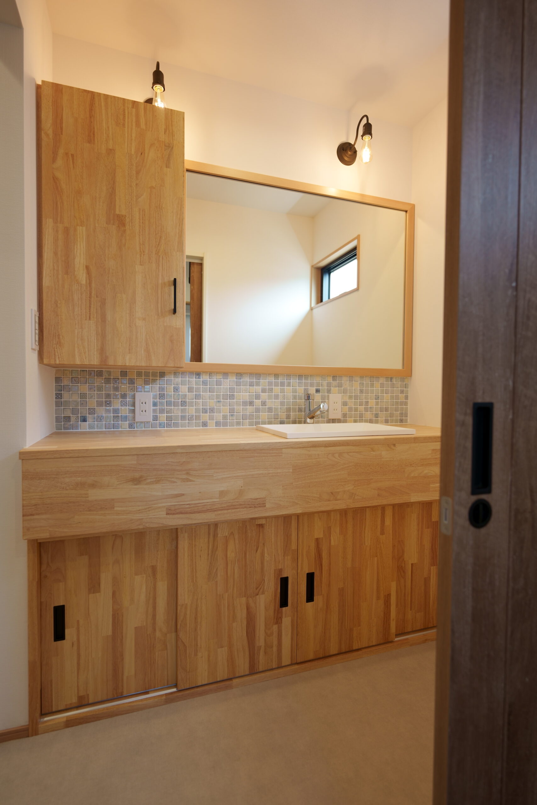 こちらのお家の洗面台は可愛いタイルと木の配色が絶妙でとってもオシャレ。